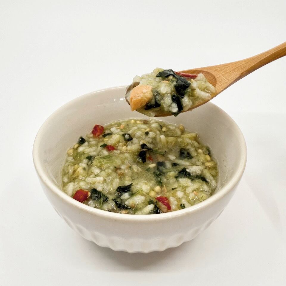 緑米や緑豆に鮭をトッピングした ほうれん草と豆乳ベースの贅沢なお粥です!