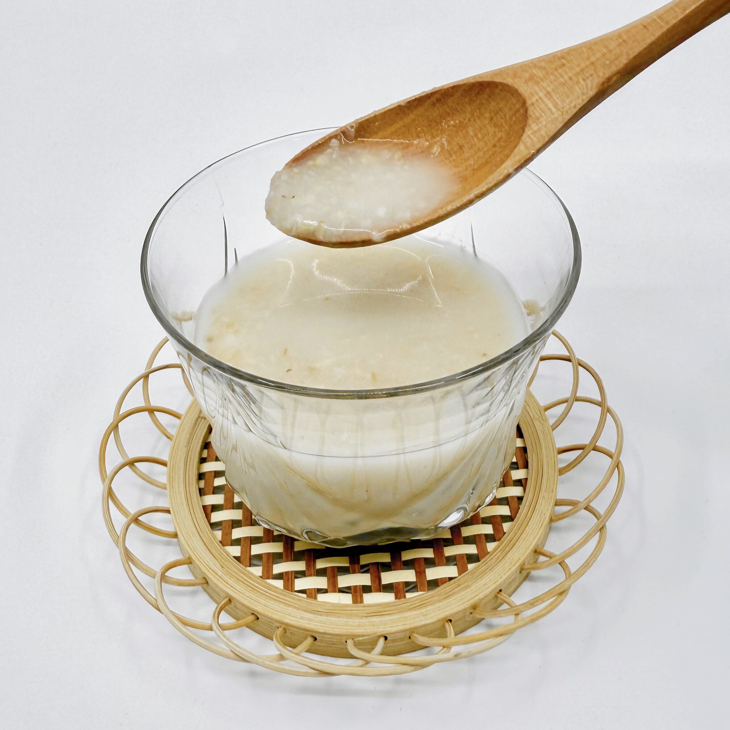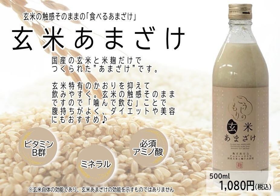 ビタミンやミネラルなどの栄養価が豊富な『玄米あまざけ』。玄米の食感が心地よく、まさに「噛んで飲むあまざけ」です。あまざけにすることで玄米特有の香りを抑え、飲みやすくしています。
